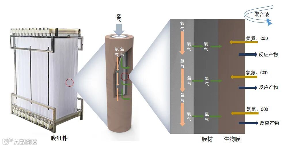 MABR是膜生物反应器的一种,是曝气技术应用于水处理的一种新形式,即采用透气性的致密膜和疏水性微孔膜,对生物反应器进行无泡曝气,更准确的说是对附着于膜材料上的生物膜供氧。膜材料本身同时起到供氧和生物膜载体的作用。