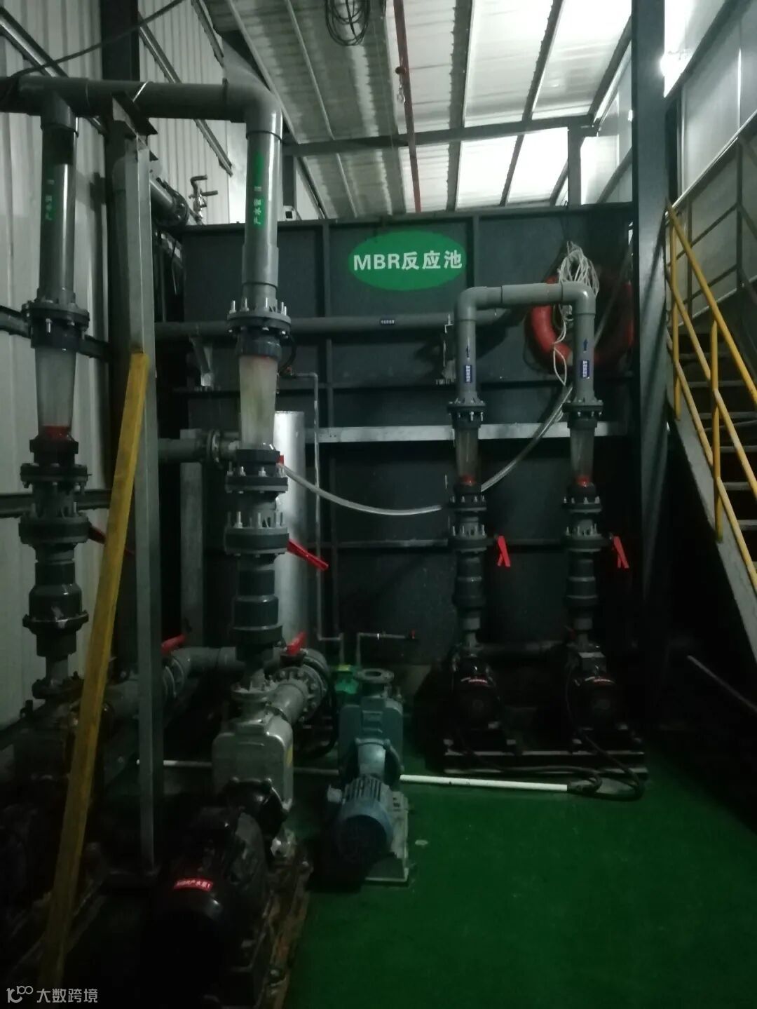 生物处理部分包括缺氧池和好氧池;膜处理部包括膜池。MBR膜分离技术采用超滤法代替传统的生物处理沉淀池,固液分离效果好,为解决回用水质问题提供可靠保障。