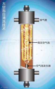 在超滤膜底部增加大空泡发生器,大空气泡在和膜丝接触时,气泡炸裂,气泡的表面张力迅速把膜孔的污染物拉走,污染物则跟随炸裂后的气泡和错流水一起排出膜壳。在大气泡清洗过后的膜丝能恢复原始通量,解决了膜丝经常需反洗药泡的技术难题。