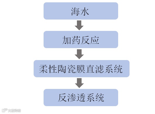海水常规工艺流程长,处理设备多,投资成本大,占地面积大,检修维护管理繁琐;现采用柔性陶瓷膜直滤系统,可以省去常规工艺中的沉淀池、砂滤/碳滤、超滤系统。缩短处理工艺,减少工艺设备和运行费用。