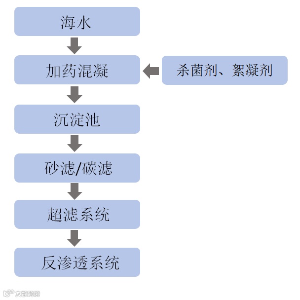 海水淡化反渗透膜法中预处理系统的常规处理工艺一般采用化学加药系统投加杀菌剂和絮凝剂进行混凝沉淀后进入石英砂和活性炭过滤系统过滤,再加上超滤系统,才能进入反渗透膜脱盐淡化系统。
