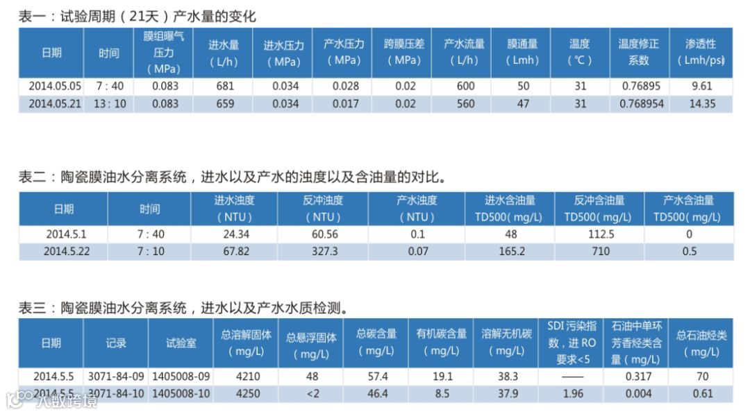该膜确实能产高质量的水,高百分比的除油率,使产水含油浓度低于1mg/L,实际产水平均含油浓度为0.18mg/L。浊度也能稳定在低数值,正如SDI的测量值。