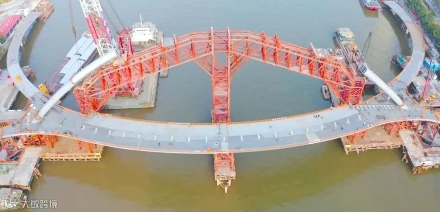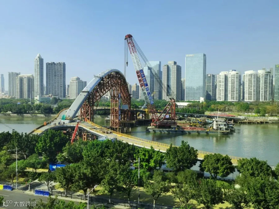 一直在紧张作业的人行景观桥,预计今年6月就完工。高耸的桥拱、弧线的造型,彷佛一道彩虹跨过珠江,人行景观桥与广州塔和珠江新城东西二塔交相辉映。