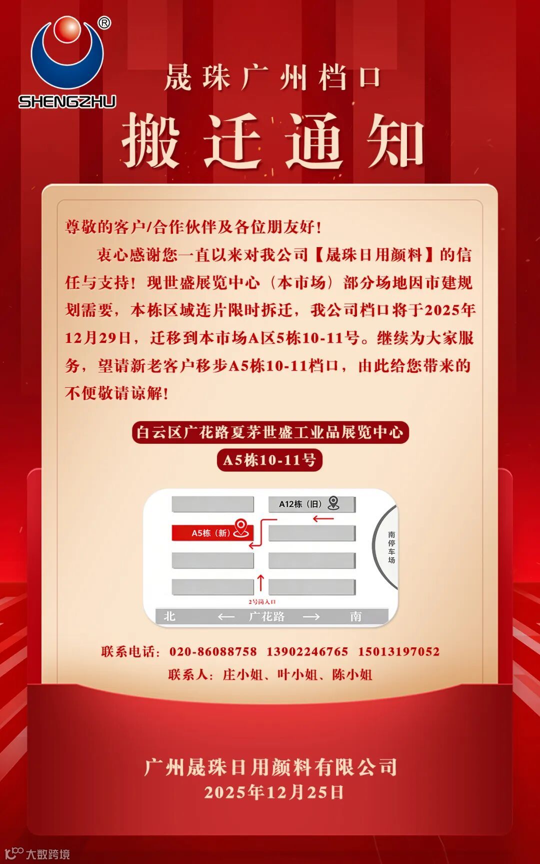 衷心感谢您一直以来对我公司【晟珠日用颜料】的信任与支持!现世盛展览中心(本市场)部分场地因市建规划需要,本栋区域连片限时拆迁,我公司档口将于2025年12月29日,迁移到本市场A区5栋10-11号。继续为大家服务,望请新老客户移步A5栋10-11档口,由此给您带来的不便敬请谅解!