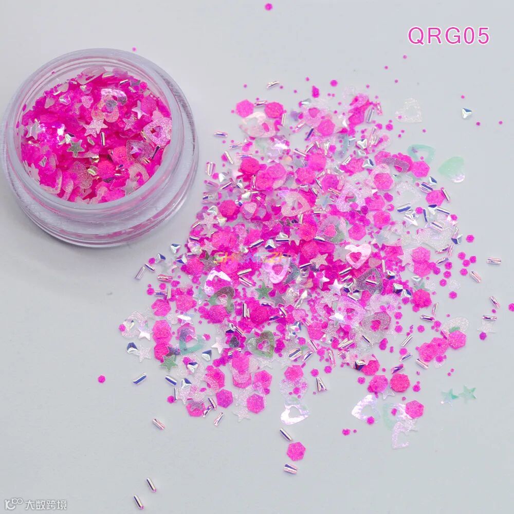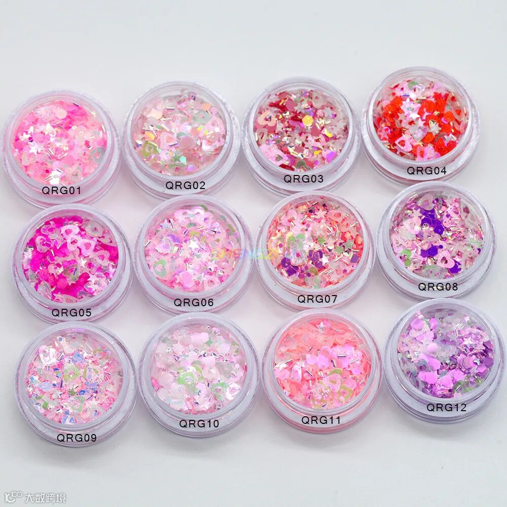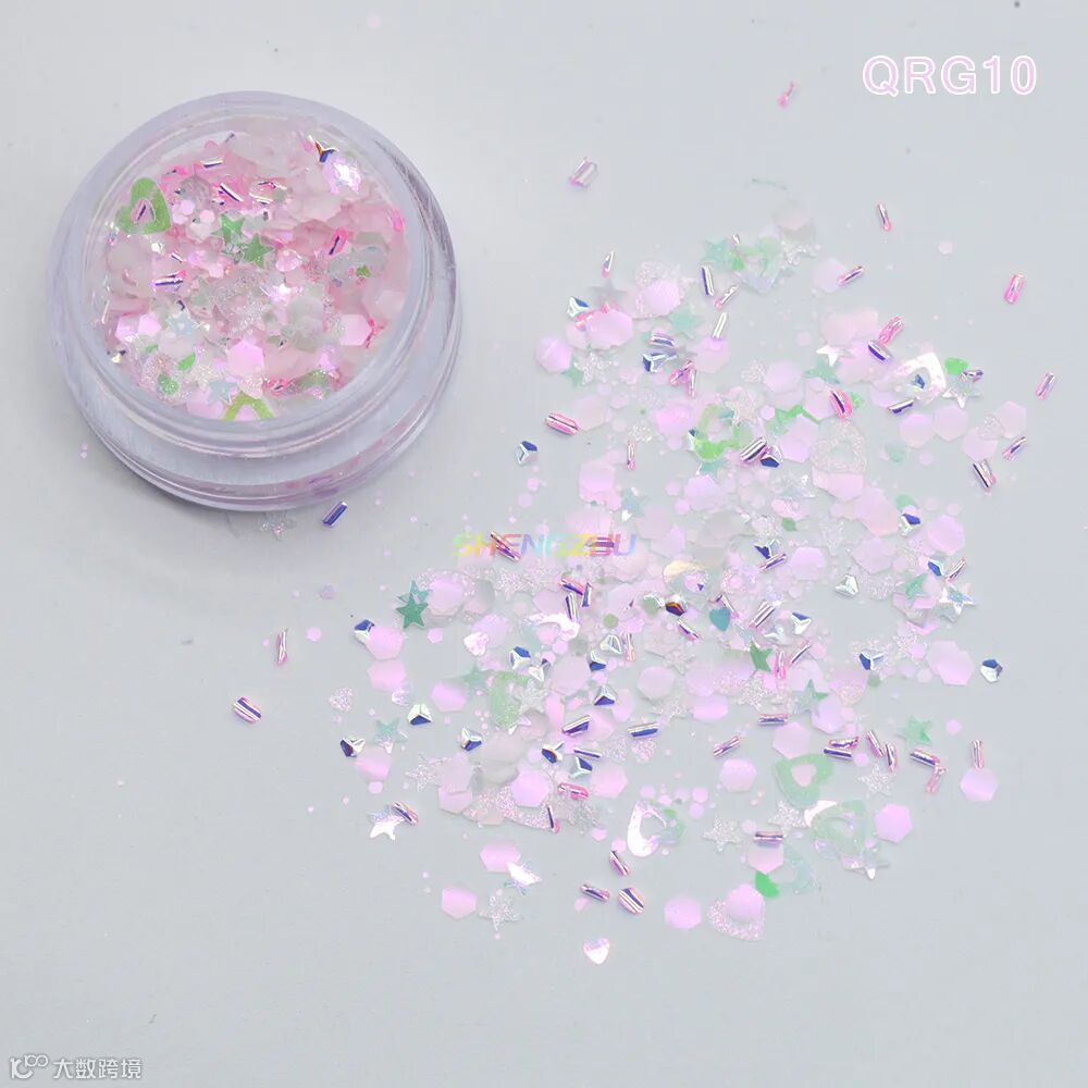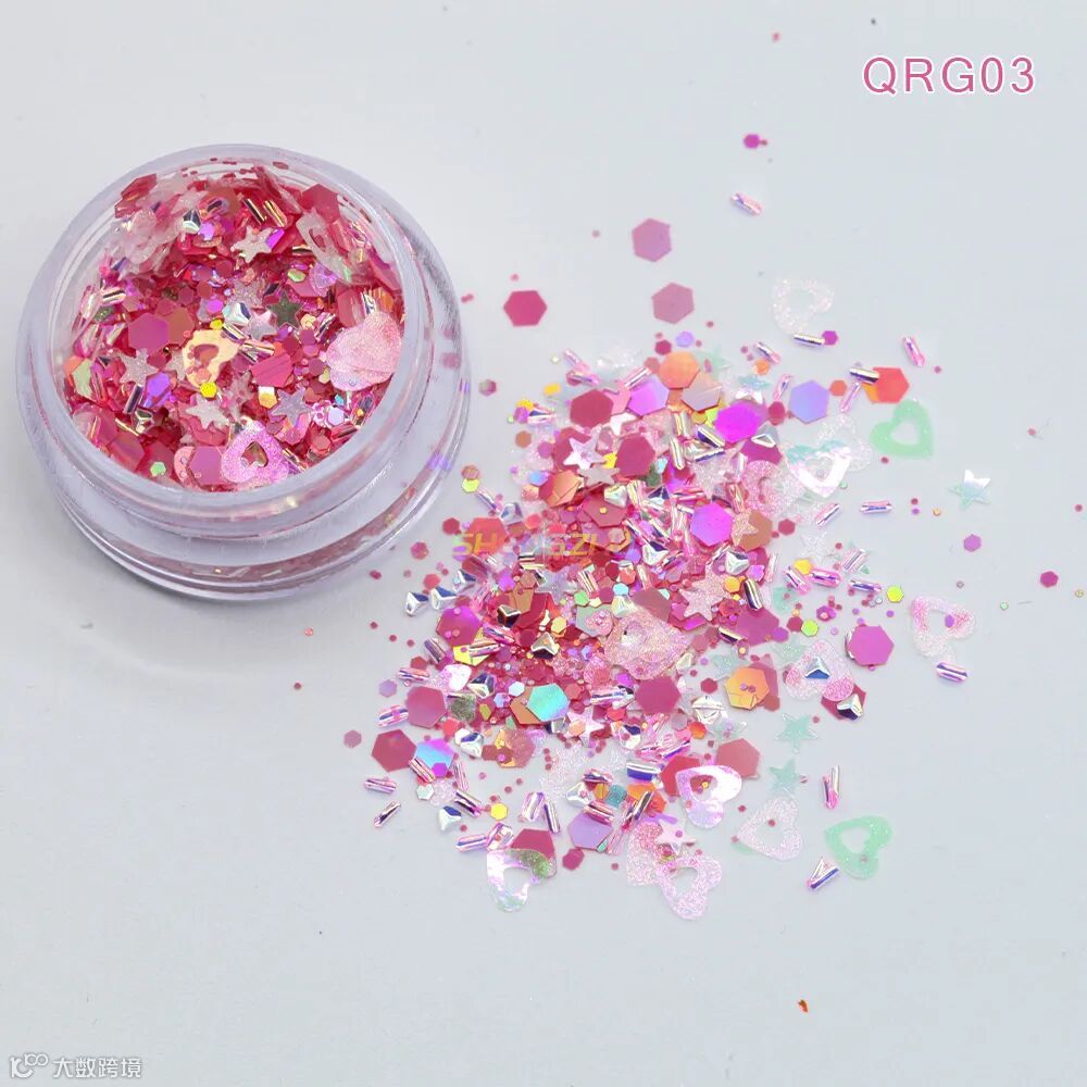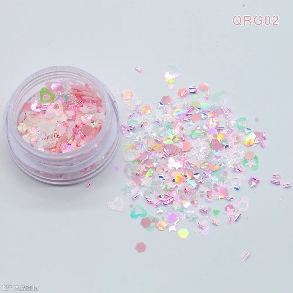 同型号搭配不同粒径亮片,细闪铺底 + 中粒提亮 + 大粒点睛,层层叠叠打造立体闪耀感,光线折射下灵动闪烁,甜而不腻,适配各种精致细节创作。