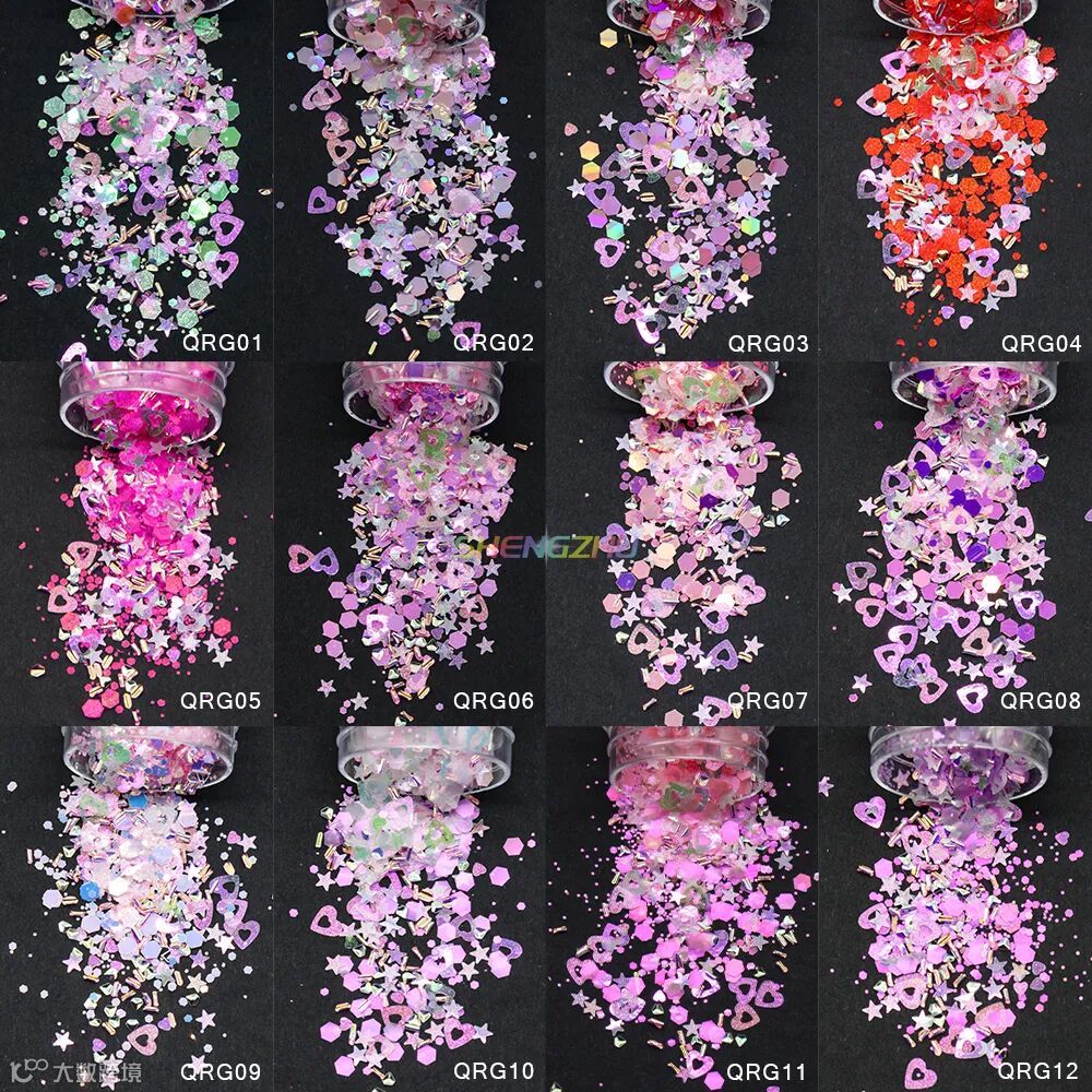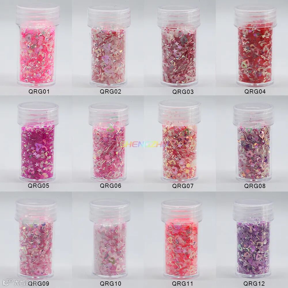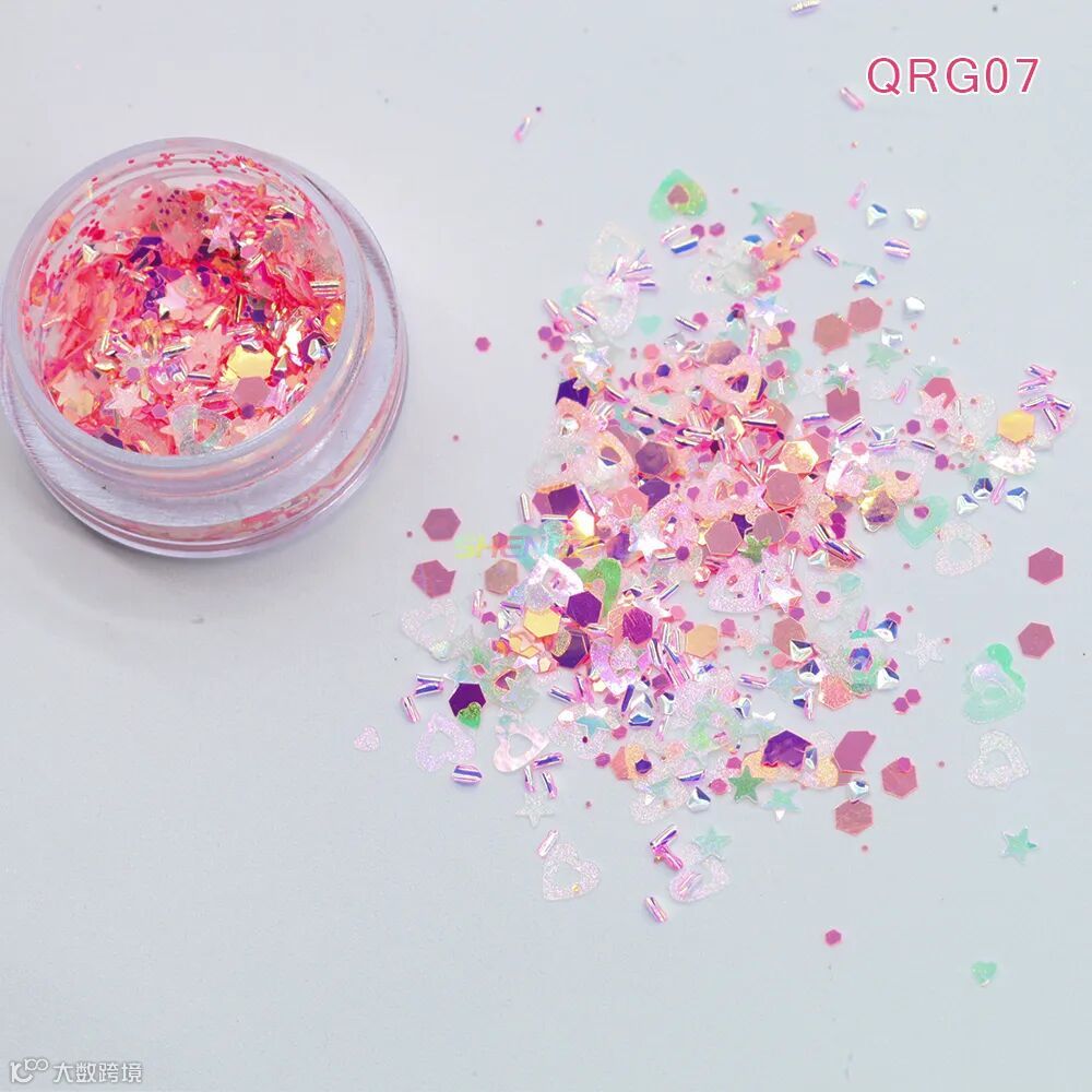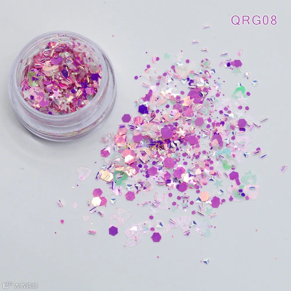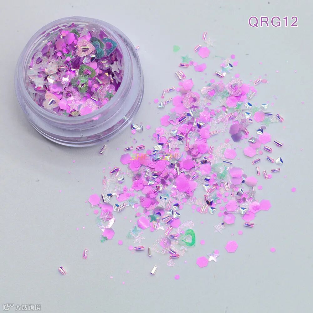 同型号搭配不同粒径亮片,细闪铺底 + 中粒提亮 + 大粒点睛,层层叠叠打造立体闪耀感,光线折射下灵动闪烁,甜而不腻,适配各种精致细节创作。