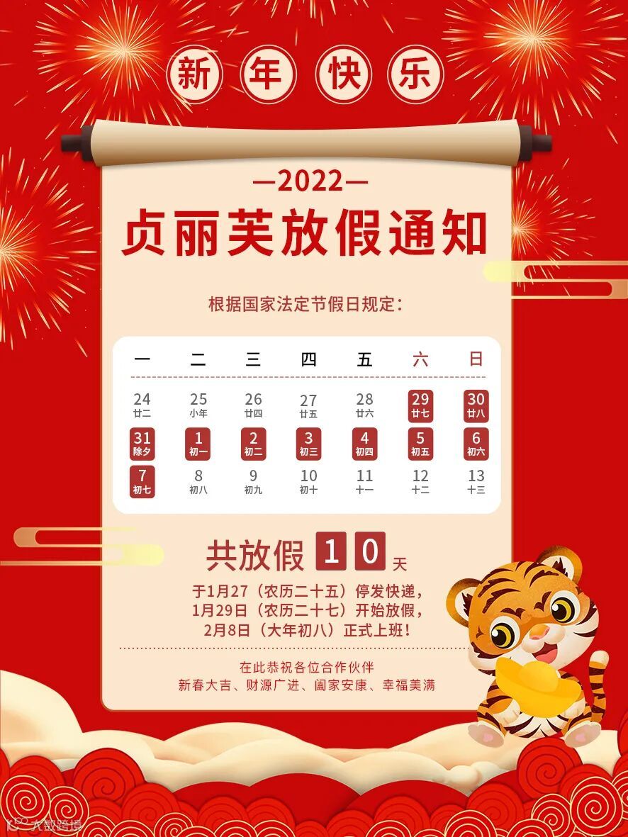 虎年新春来临之际,贞丽芙小编(斗胆)代表贞丽芙公司所有员工,祝各位客户、供应商和代理商们,新春吉祥,阖家安康。