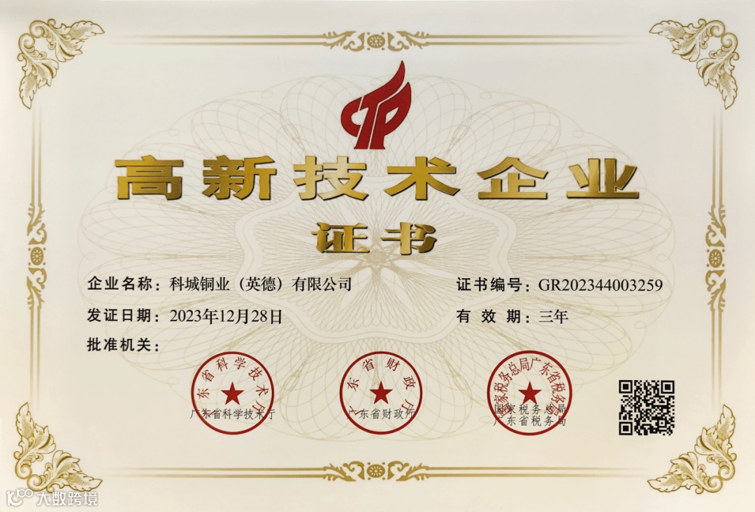 国家高新技术企业认定是由国家科技部、财政部和国家税务总局联合发起的一项国家级荣誉,每三年评选一次,是对企业在科技综合实力方面最权威的评价。本次认证通过,充分证明了科城铜业在自主知识产权、技术研发投入、科技成果转化能力和组织管理能力等方面综合实力的稳进发展,将对公司新产品研发、产学研合作等方面形成强大发展助力。