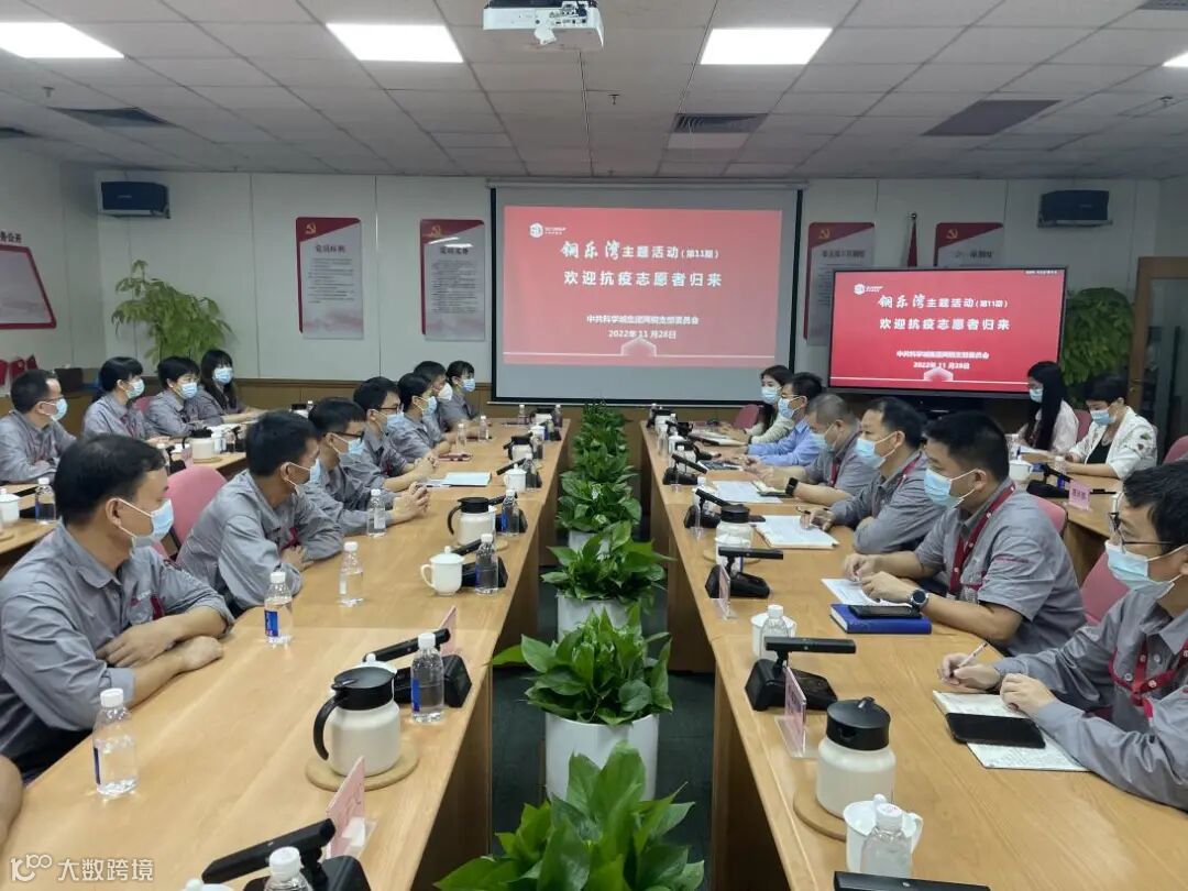 2022年11月28日上午,两铜党支部开展铜乐湾主题活动(第11期)--迎接抗疫志愿者归来座谈会。迎接第二批支援白云区、海珠区抗疫志愿者朱君妹、张步金、曾远清、林庆生、乐小龙,支援方舱医院建设唐劲民、兰礼师、杨子文、陈铁年、胡文礼等10名同志平安归来。公司党支部书记、董事长童建斌,党支部副书记、总经理晏静,党支部副书记谭小洁,党支部纪检委员、副总经理胡志刚等同志参加了会议。