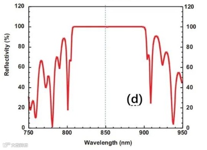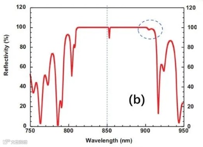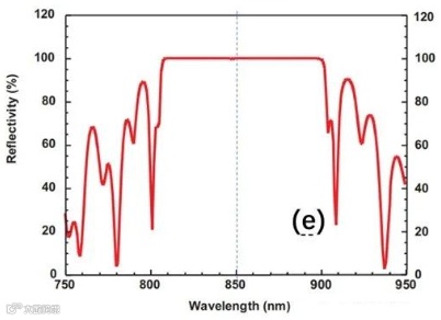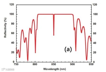 这是理想生长结构的反射谱。FP谐振腔的共振峰凹陷很深,位于反射带的中心850 nm。