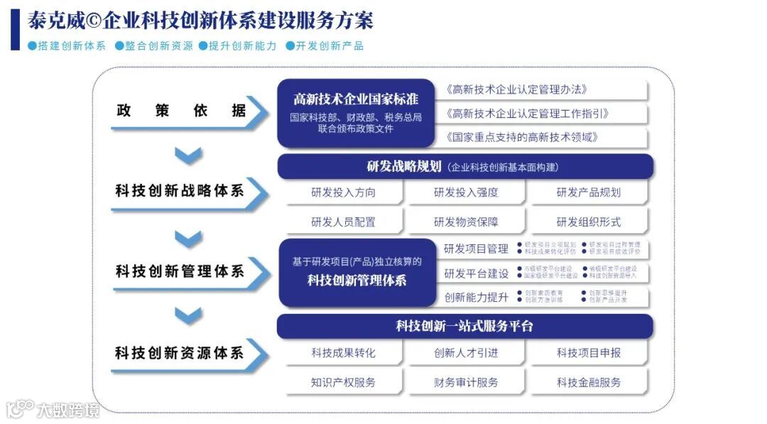 泰克威17年的发展得益于高新技术企业的培育和发展,也始终将培育真正具有创新能力、核心竞争力的高新技术企业作为泰克威的宗旨和使命。我们有能力、有信心,以泰克威科技咨询专家委员会(TCEC)为代表的高度专业和服务水平,以泰克威首创于行业的解决方案和服务范式,真正成为企业健康、合规发展的伙伴和同行者,使泰克威服务的企业客户真正走上规范化、可持续的创新发展之路。