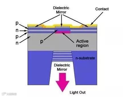VCSEL作为一种半导体激光器,形成激光发光需要完成能量激发和共振放大两个步骤。