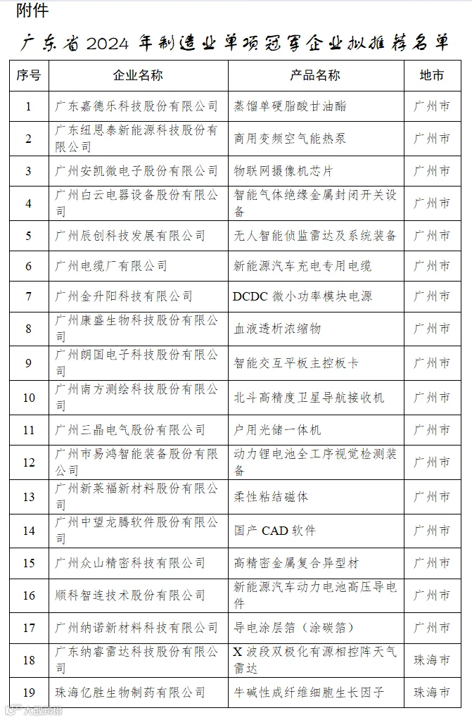 关于广东省2024年国家级制造业单项冠军企业拟推荐名单的公示