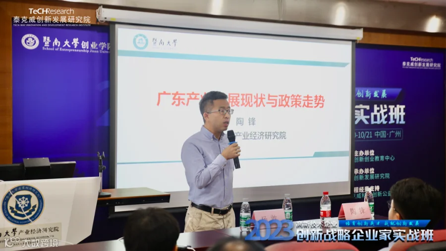 下午,暨南大学产业经济研究院院长陶锋则以《广东产业发展现状与政策走势》的主题进行了分享。陶锋教授以长达十几年的产业发展研究经验,对广东省产业发展现状以及外部环境进行了深入分析,并详细阐述了广东产业发展中需要关注的重要问题,强调了要具备产业思维,强化产业研究。