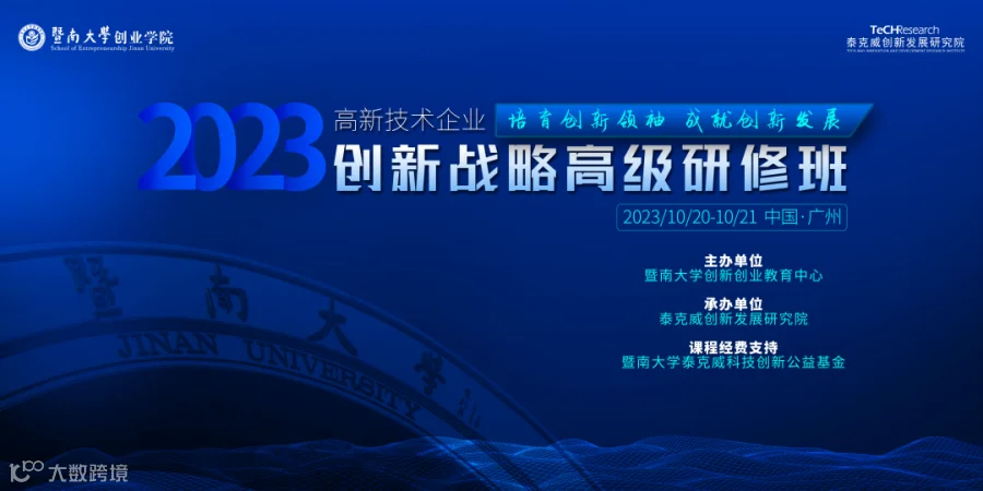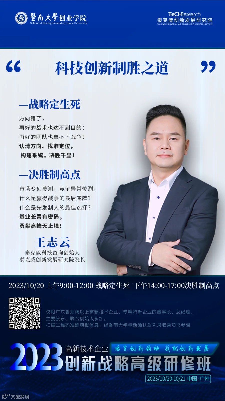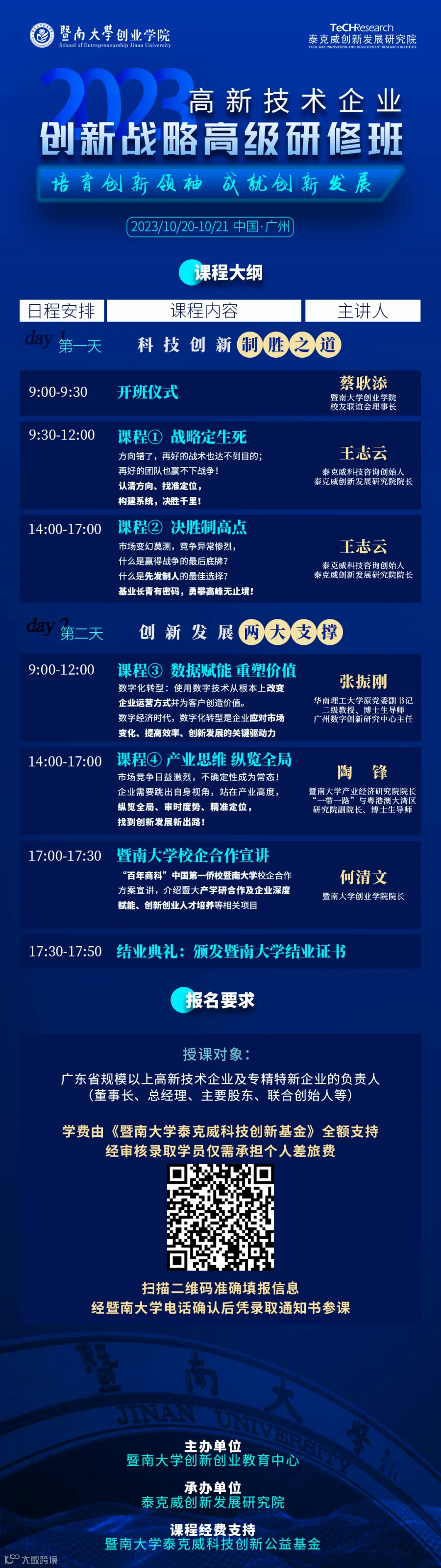 为深入贯彻落实党的二十大精神,进一步发挥科技创新的重要作用,培育新一代具有创新精神的企业家,助力企业家做好创新发展的探索者、组织者、引领者,由暨南大学创新创业教育中心主办,泰克威创新发展研究院承办,暨南大学泰克威科技创新公益基金经费支持的《高新技术企业创新战略高级研修班》将于10月20日-21日在暨南大学正式开课!