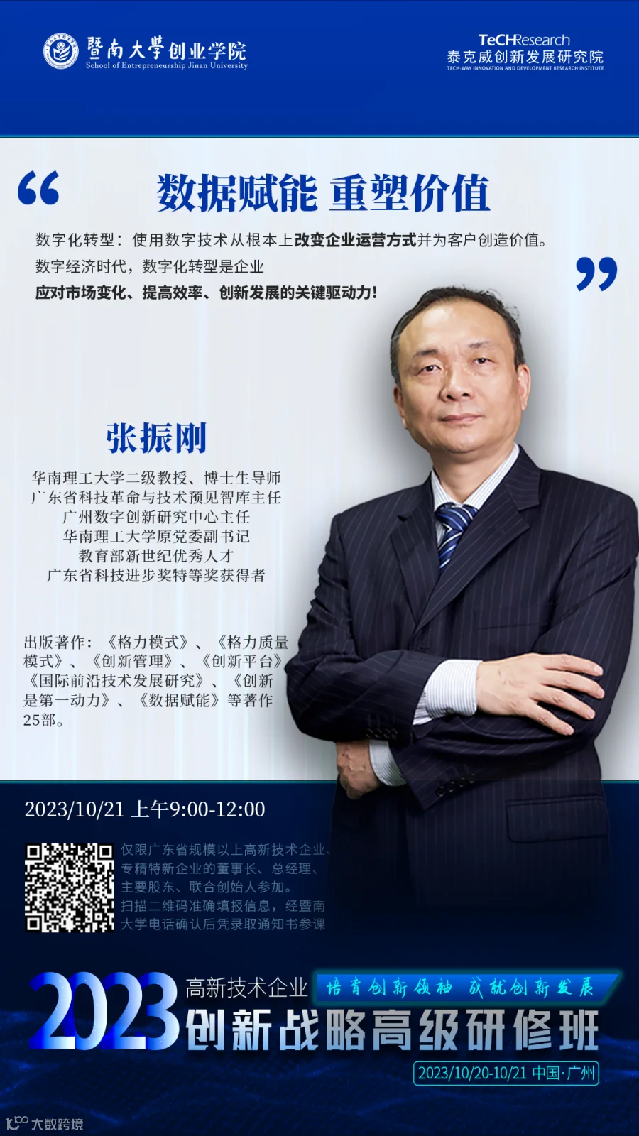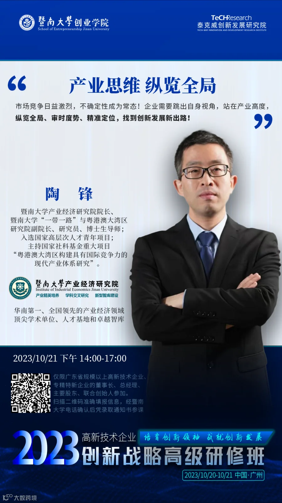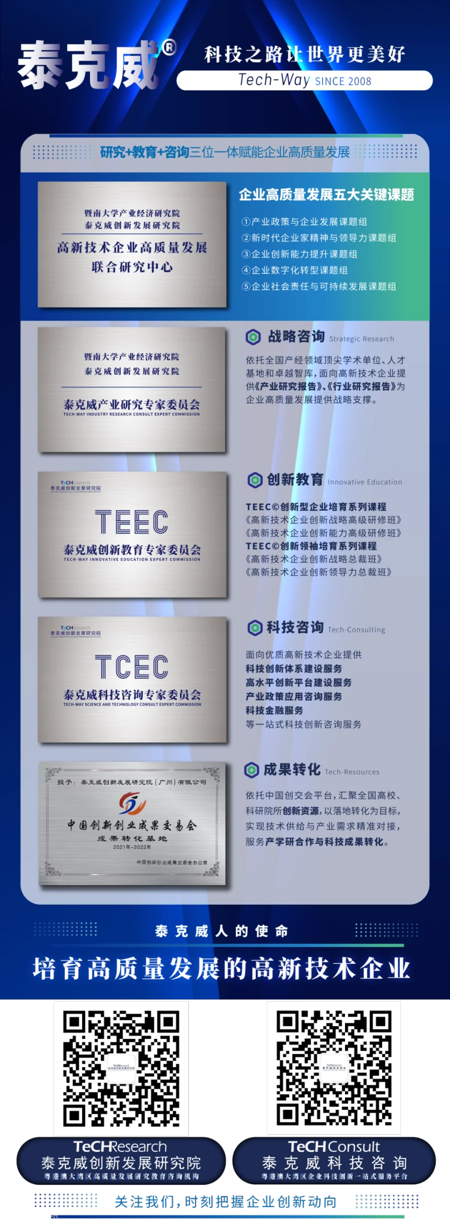 为深入贯彻落实党的二十大精神,进一步发挥科技创新的重要作用,培育新一代具有创新精神的企业家,助力企业家做好创新发展的探索者、组织者、引领者,由暨南大学创新创业教育中心主办,泰克威创新发展研究院承办,暨南大学泰克威科技创新公益基金经费支持的《高新技术企业创新战略高级研修班》将于10月20日-21日在暨南大学正式开课!