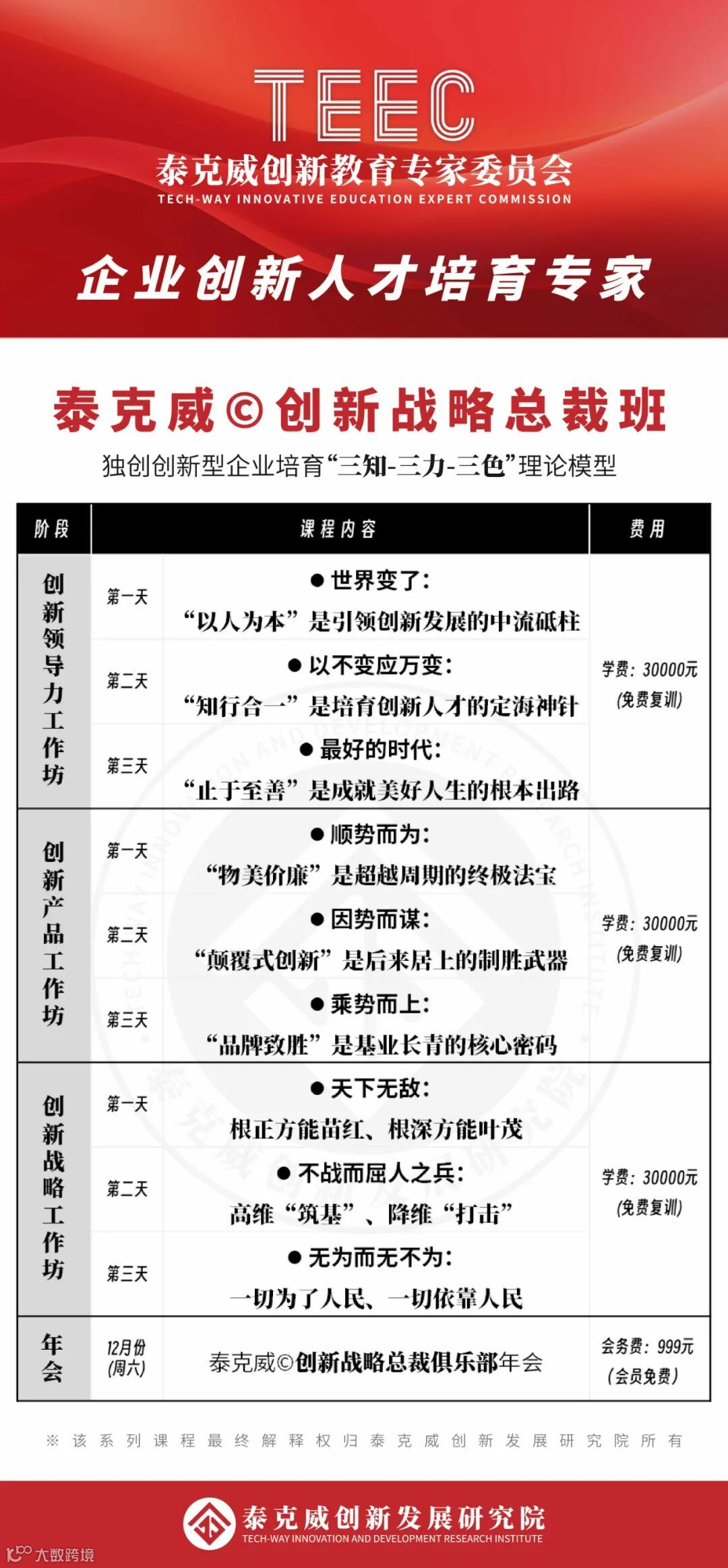 为感谢过去一年广大《高新技术企业创新战略企业家实战班》、《高新技术企业创新战略总裁班》学员对课程的热烈响应与高度认可,TEEC发起成立泰克威©创新战略总裁俱乐部,正式招募创始会员(限99名),可享终身免费学习。具体申请方式请联系课程助教老师。