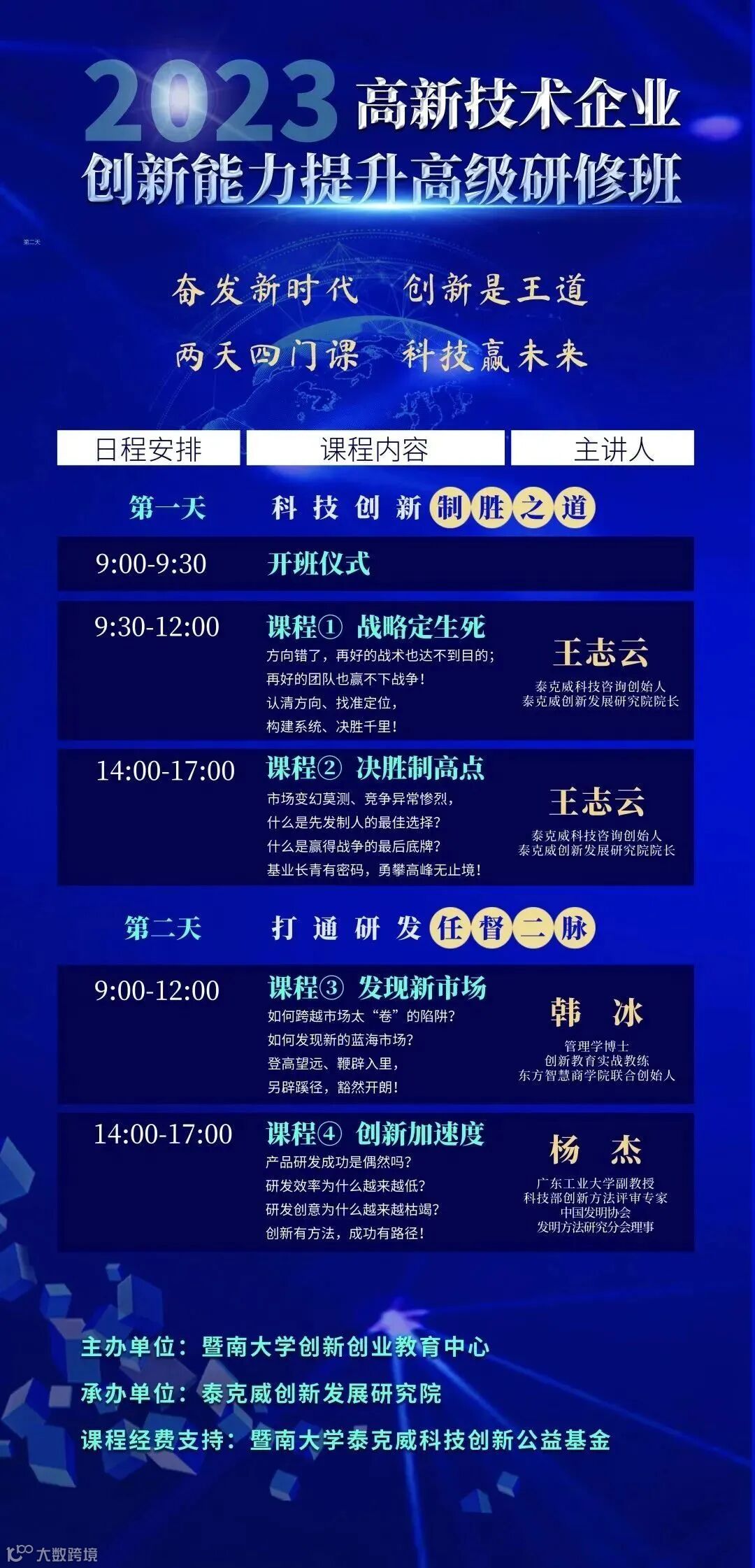 2023年5月至9月,泰克威联合暨南大学创新创业教育中心,首先开办3期《高新技术企业创新能力提升高级研修班》,分别于暨南大学本部以及江门开展。创新能力提升研修班面向广大制造业的科技创新骨干,技术研发团队,用2天4门课,贯通企业创新战略到创新方法,构建企业创新的完整认知和方法。