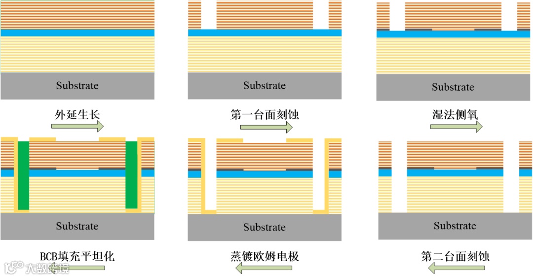 其中侧氧工艺是VCSEL芯片制程中的重点和难点,因为侧氧工艺制作氧化限制孔的工艺参数与VCSEL的光参数、电参数以及热参数有着直接联系。