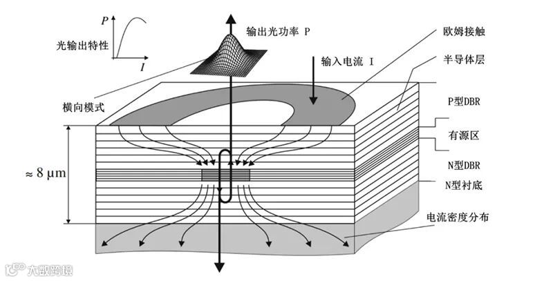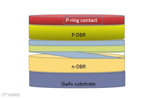 VCSEL一般是三明治结构,主要包括上、下的多层布拉格反射镜(DBR)和中间有源区形成激光器的腔体(谐振腔)。