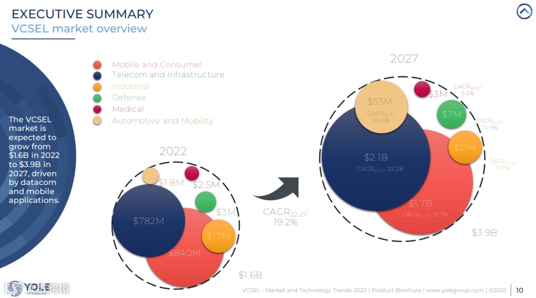 据Yole Intelligence发布的年度《2022年VCSEL市场和技术趋势》报告显示,未来5年VCSEL整体市场还是将保持高速增长趋势,或以19.2%的年均复合增长率(CAGR)增长,到2027年市场规模将达到39亿美元(约人民币277亿元)。
