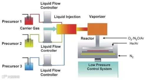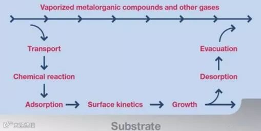目前,国内的各大厂家均采用MOCVD的方式,其原理是利用前驱物借由高精准度的注入喷头,精确地控制进入汽化反应及制程反应腔体反应物的量,并且借由反应气体与其进行化学反应。这些反应后的金属有机化合物,会在基板的表面进行吸附——表面反应——薄膜成长——形成一层薄膜。