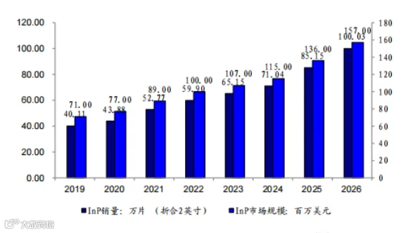 目前磷化铟的主要市场驱动力仍然是数据通信和电信。根据Yole统计显示,到2026年全球光模块器件磷化村底(折合两英寸)预计销量将超过100万片,2019年2026年复合增长率达13.94%,2026年全球光模块器件磷化钢村底预计市场规模将达到1.57亿美元,2019-2026年复合增长率达13.94%