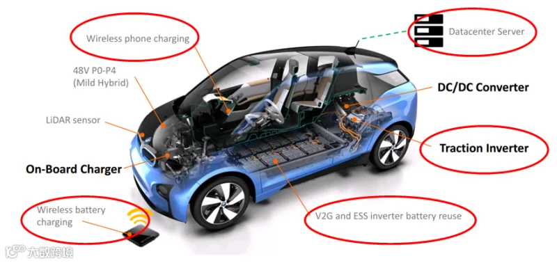 在汽车领域,GaN主要应用于48V系统的功率电子、车载充电机和DC/DC转换器,将来可以扩展到逆变器。