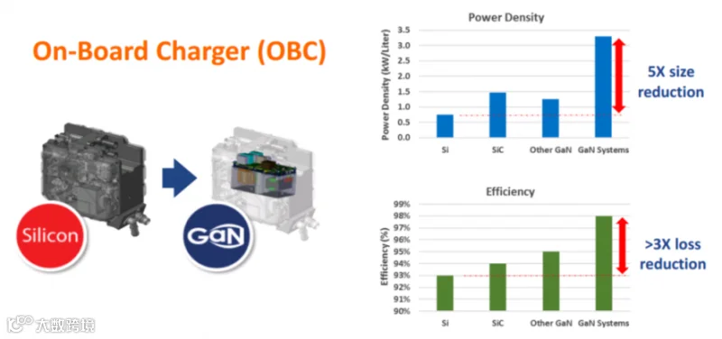 以车载充电机(OBC)为例,使用GaN的器件,可以实现尺寸上减少到原来的五分之一,充电效率可以增加到98%,损耗下降 33%,并且减小散热的结构。