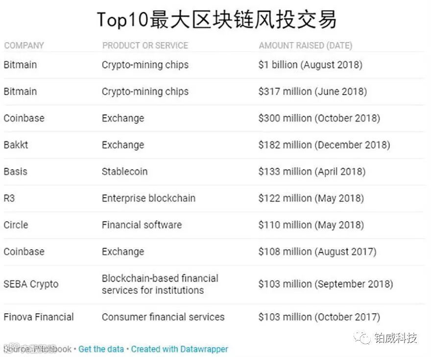 风险投资的大量涌入可能反映了2017年末和2018年初加密货币价格飙升时投机投资者普遍存在的一些非理性繁荣。不同之处在于,这些风险投资是对公司的长期押注,而不是对加密货币价格上涨的短期押注。其中一些甚至是非常大的赌注。根据PitchBook,区块链公司有史以来十大风险投资交易中有八项发生在2018年。中国挖矿芯片制造商比特大陆依靠自身就融资超过13亿美元。