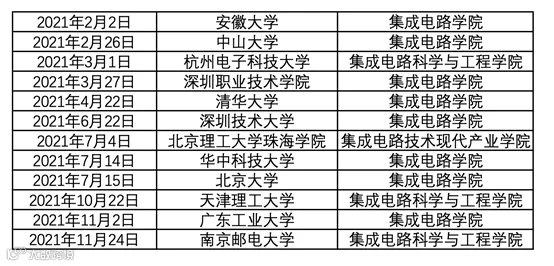 4月清华大学成立集成电路学院、随后北京航空航天大学宣布成立集成电路科学与工程学院、7月华中科技大学、北京大学成立集成电路学院。据统计,2021年国内12所高校新成立了集成电路学院。