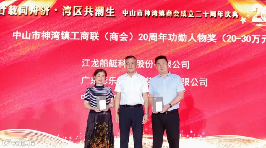适逢神湾镇商会成立二十周年,庆典同步举行。加入神湾镇商会以来,彩乐响应商会号召,积极参与商会活动。在庆典表彰环节,我司被授予“铜牌赞助奖”、“功勋人物奖”,李董(左起第三位)上台领取荣誉奖牌。