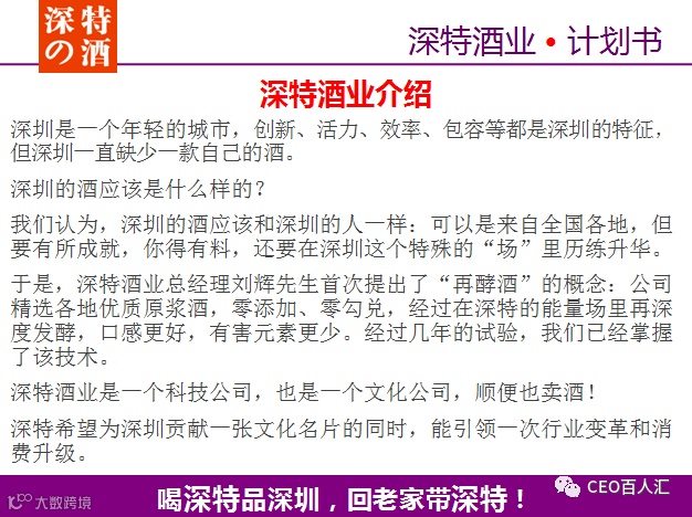 1、文化产业,品牌经营,深特酒定位为深圳的文化名片,是科技公司、是文化公司,聚焦深圳,也卖酒;