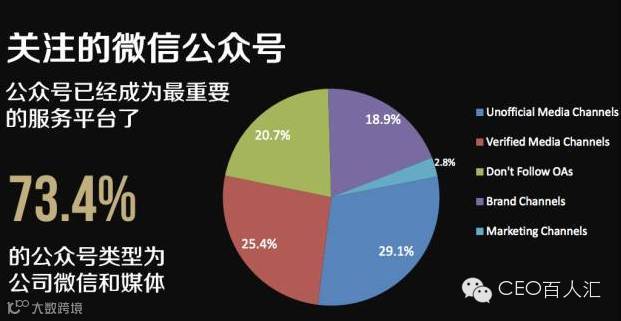 29.1%的用户关注了自媒体、25.4%的用户关注了认证媒体、20.7%的用户没有关注任何公众号、18.9%的用户关注了企业商家、而5.9%的用户则关注了营销推广类账号。