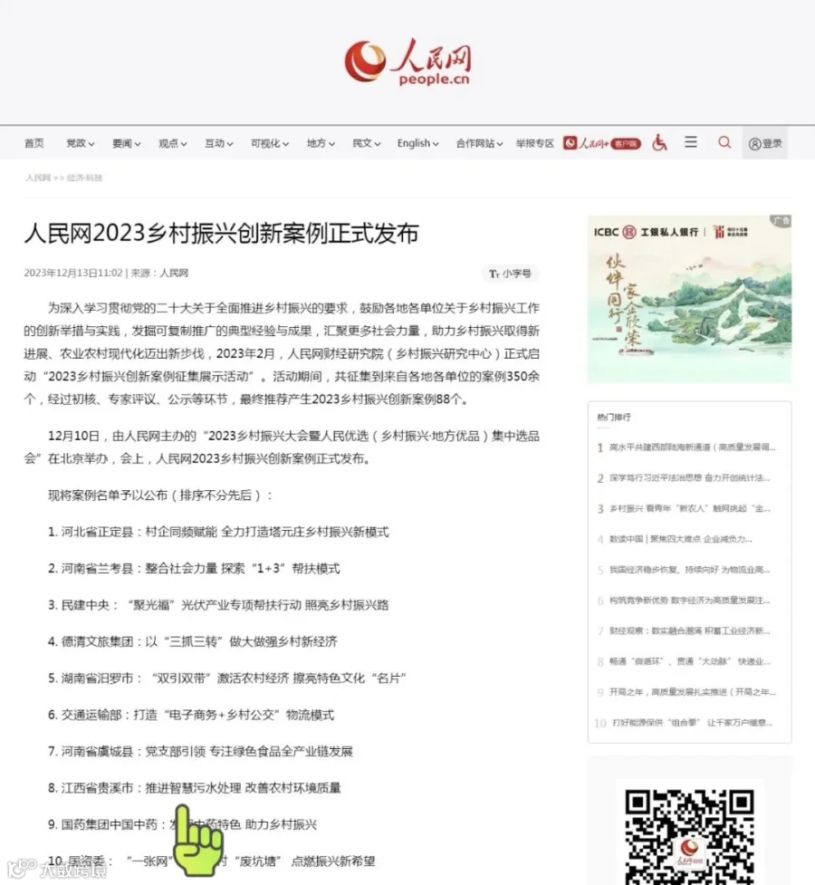 ▲人民网官方新闻报道,推进智慧污水处理入选“2023乡村振兴创新案例”(第8条手指图标处)