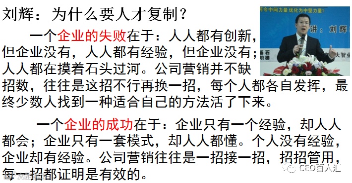 在这里,原本个性化的知识被标准化了,原本分散在每个人头脑中的经验被集中和优化了。完善的内部复制系统,当然还需要老板的大力支持,一旦成形了可谓一劳永逸。