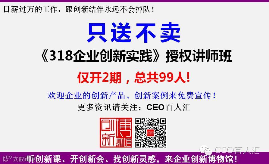 花了大力气开发的《318企业创新实践》课程,首先就免费培训99个授权讲师,以后也不用分我一毛钱!正如特斯拉免费开放专利,市场足够大,教会了徒弟师傅会活的更好!