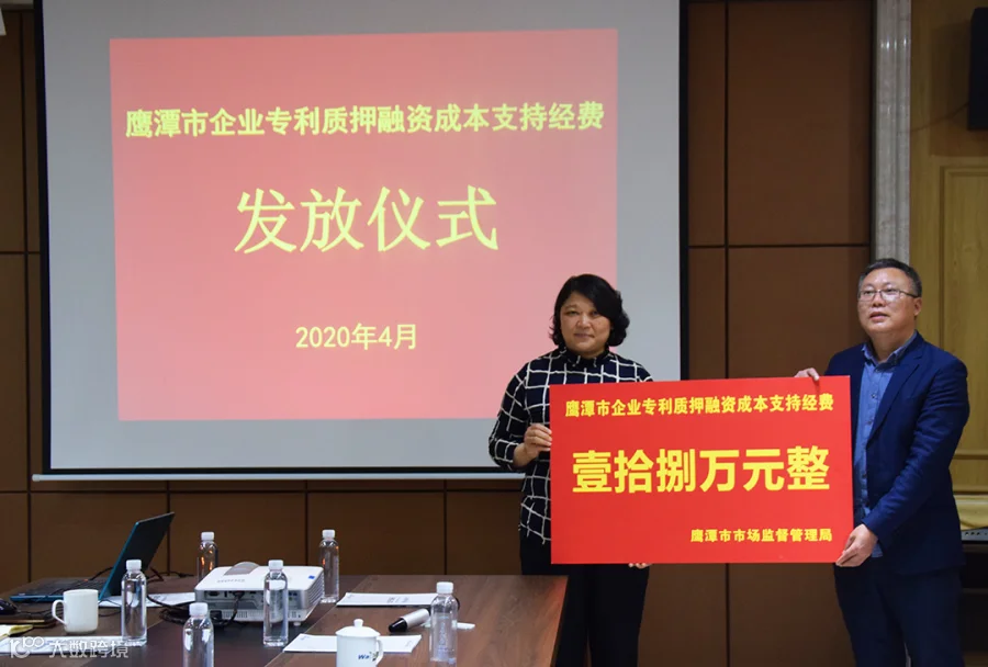 2020年4月16日下午,鹰潭市企业专利质押融资成本支持经费发放仪式在渥泰举行。鹰潭市场监督管理局知识产权科科长段惠承一行参加并向渥泰发放经费壹拾捌万元整,渥泰执行董事金君芳女士代表渥泰领取了此项经费。