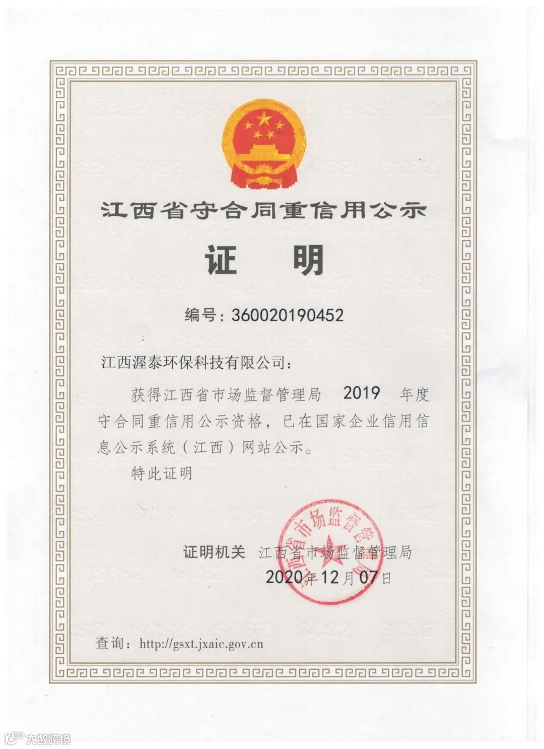近日,江西省市场监管局公示了2019年度“守合同重信用”公示单位企业名单,江西渥泰环保科技有限公司荣获2019年度江西省“守合同重信用”公示单位。