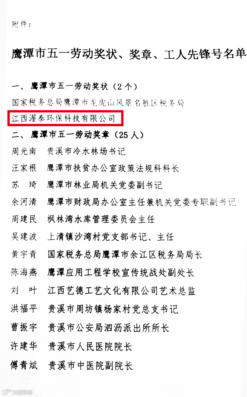获奖名单中有2家单位荣获“鹰潭市五一劳动奖状”。江西渥泰环保科技有限公司荣获“鹰潭市五一劳动奖状”,获此殊荣是鹰潭市市委、市政府及社会各界对渥泰所取得成就的认可和鼓励。同时,也是对渥泰未来发展的鞭策和期许。