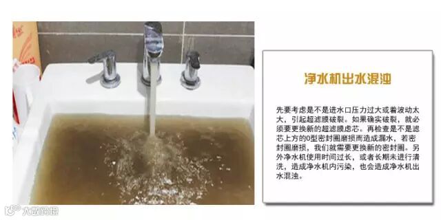 2.净水机出水混浊。首先要考虑是不是进水口压力过大或着波动太大,引起超滤膜破裂。如果确实破裂,就必须要更换新的超滤膜虑芯。再检查是不是滤芯上方的O型密封圈磨损而造成漏水,若密封圈磨损,我们就需要更换新的密封圈。另外净水机使用时间过长,或者长期未进行清洗,造成净水机内污染,也会造成净水机出水混浊。