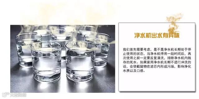 1.净水机出水有异味。我们首先需要考虑,是不是净水机长期处于停止使用的状态,当净水机停用一段时间后,再次使用之前一定要反复清洗,排除净水机内残存的死水。如果家用净水机长期不进行冲洗的话,会使截留物在滤芯内形成污垢,影响净化水质以及口感。