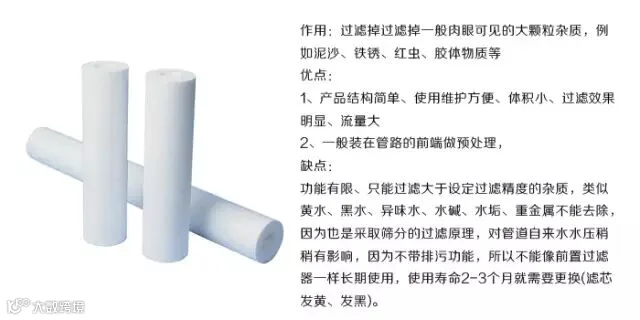 功能有限、只能过滤大于设定过滤精度的杂质,类似黄水、黑水、异味水、水碱、水垢、重金属不能去除,因为也是采取筛分的过滤原理,对管道自来水水压稍稍有影响,因为不带排污功能,所以不能像前置过滤器一样长期使用,使用寿命2-3个月就需要更换(滤芯发黄、发黑)。