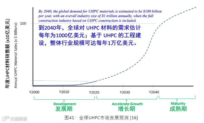 2023年,中国在超高性能混凝土(UHPC)领域实现了多方面的重要进展,其发展势头强劲,UHPC的价值和应用潜力逐渐获得业界的广泛认可和利用。在美国举行的UHPC 2023国际研讨会上,来自加拿大的V.H. (Vic) Perry先生引用了乔布斯(Steve Jobs)在其著作中提到的技术市场发展的S形曲线理论,对UHPC市场的未来发展进行了预测。Perry先生预计,到2040年,全球对UHPC材料的需求将达到每年1000亿美元,而基于UHPC的工程建设的总行业规模更是可望达到每年1万亿美元。