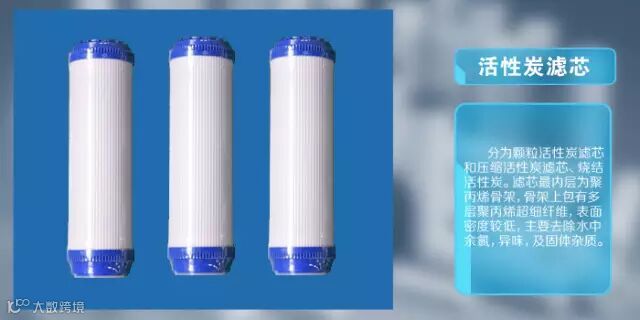 分为颗粒活性炭滤芯和压缩活性炭滤芯、烧结活性炭。滤芯最内层为聚丙烯骨架,骨架上包有多层聚丙烯超细纤维,表面密度较低,具有极高的吸附能力,进一步吸附水中的各类残留污染物、农药、化肥、三氯甲烷等有机物,基本使水质达到无色无味。其中效果比较的话,压缩活性炭大于烧结活性炭;烧结活性炭大于颗粒活性炭。另外包裹活性炭的外壳也要求无污染、裂痕、毛边;进/出水端有过滤装置,能有效防止活性炭渗漏。过滤水量约为12吨,建议3-6个月左右更换。