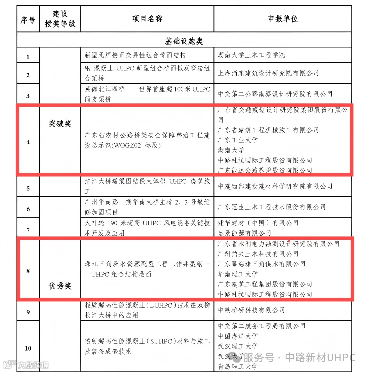 2025年伊始,中路新材旗下中路杜拉国际工程股份有限公司传来喜报,在中国混凝土与水泥制品协会-超高性能水泥基材料与工程技术分会举办的UHPC创新奖(2023-2024年度)评审中,得益于“广东省农村公路桥梁安全保障整治工程建设总承包(WOGZ02 标段)”及“珠江三角洲水资源配置工程工作井型钢-UHPC组合结构屋面”两项目的合作单位的大力支持,中路杜拉喜获基础设施类的突破奖和优秀奖。