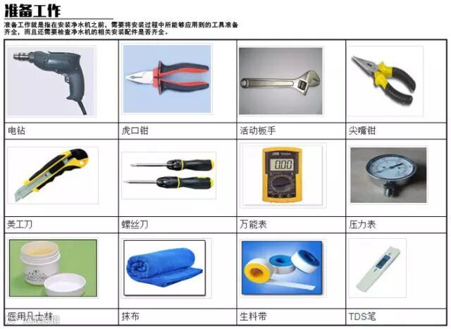 准备工作就是指在安装净水机之前,需要将安装过程中所能够应用到的工具准备齐全,而且还需要检查净水机的相关安装配件是否齐全。