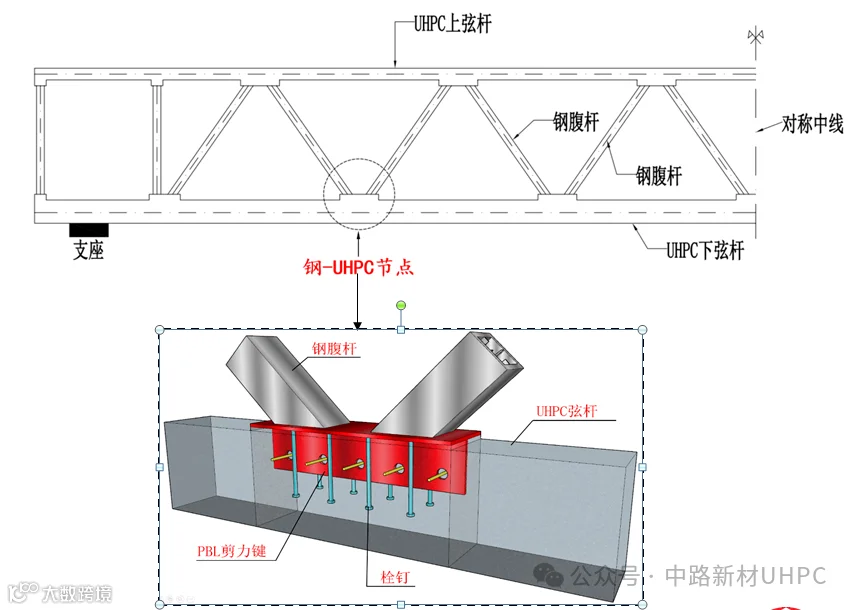 在主桥上下弦杆及横梁方面,设计采用了先进的UHPC构件,同时腹杆则采用了坚固耐用的钢结构;桥面板则选用预制UHPC混凝土桥面板,确保了桥面的平整度和耐久性;为了增强节点连接的牢固性,钢混节点采用了PBL+栓钉组合连接键,进一步提升了整座桥梁的结构性能。