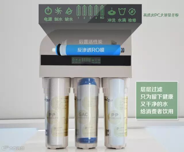 经过前三级滤芯处理后,水中部分较大的杂质已经被排除了,RO膜孔径在0.0001微米,主要去除水中除纯水之外的其他细小污染物,如:细菌、病毒、余氯等。