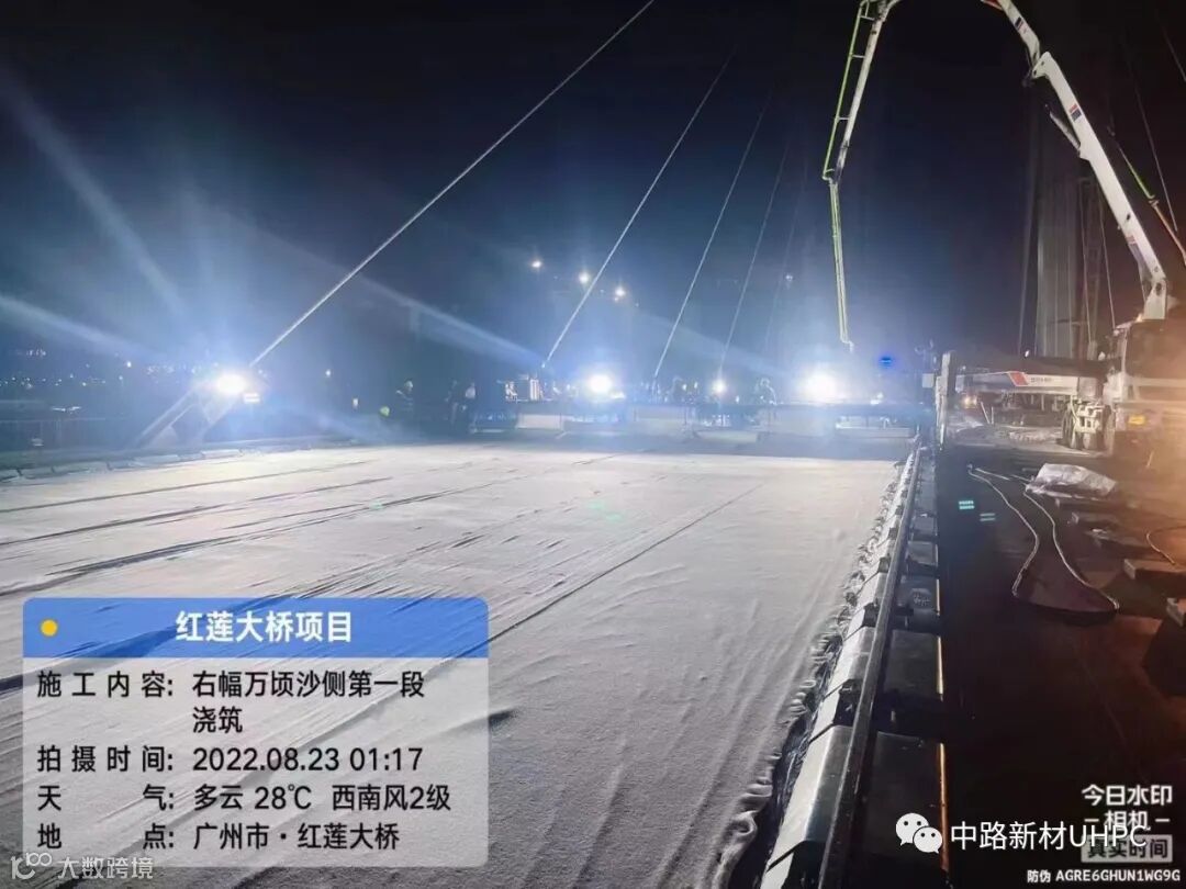 夏末初秋,粤港澳大湾区广州南沙片区的建设犹如炎热的天气持续发热,如火如荼。8月23日凌晨,红莲大桥桥面施工场地灯火通明,中路新材(广州)科技有限公司、湖南中路华程桥梁科技股份有限公司UHPC桥面施工项目经理李沧对现场作业人员进行技术安全交底后,南沙主跨580m双塔双索面混合梁斜拉桥红莲大桥UHPC第一幅浇筑拉开序幕,标志着大湾区南沙片区首座超500米大桥首次应用新材料UHPC。